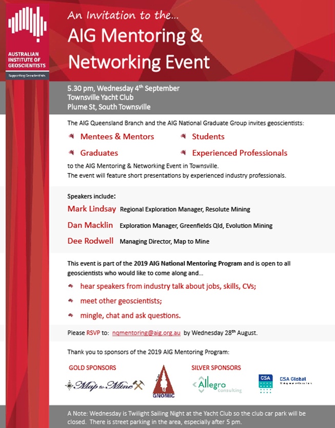 The AIG Mentoring Program is holding a mentoring and networking event in Townsville on Wednesday 4th September. There will be brief talks by industry professionals, followed by informal networking.