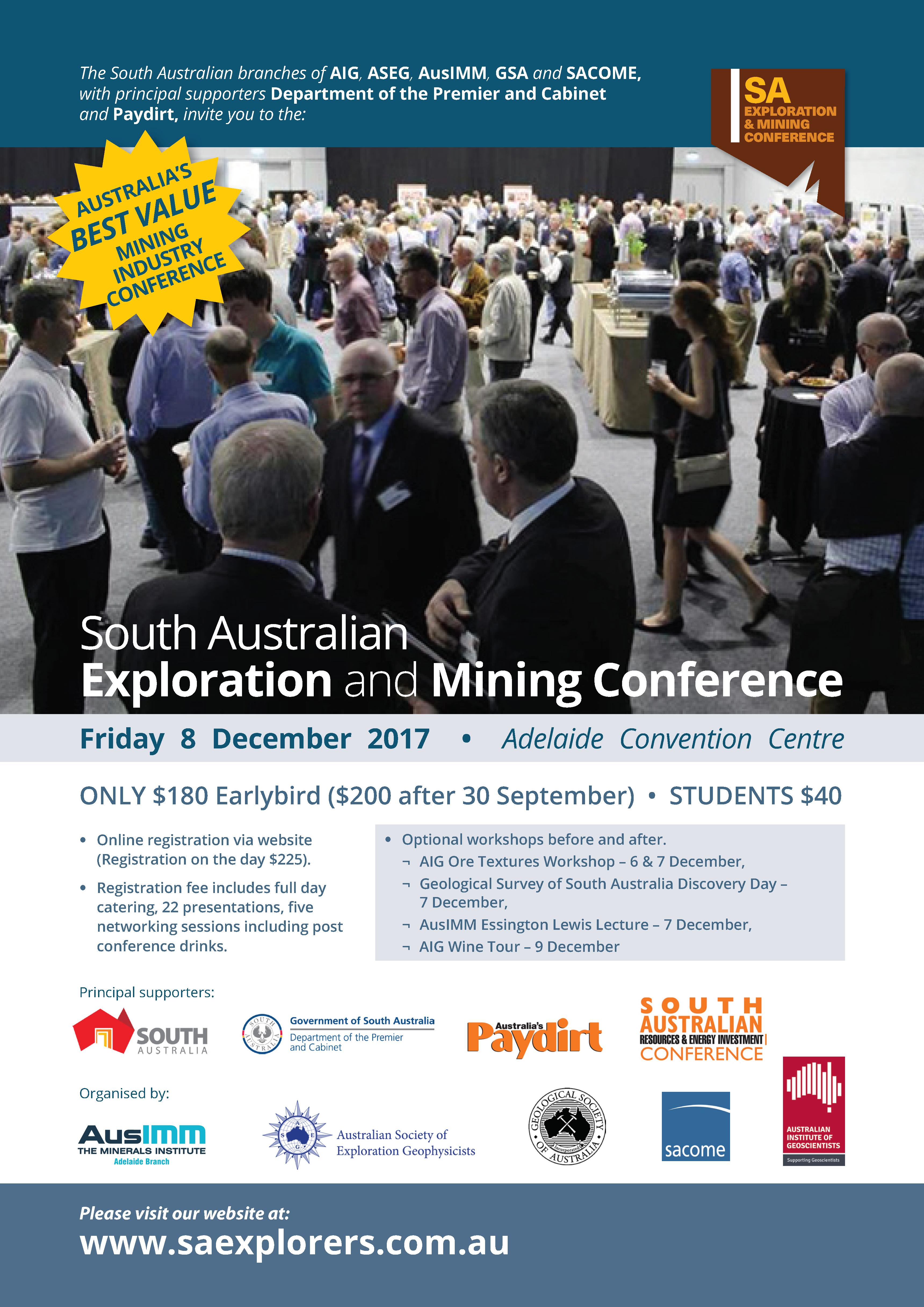 The South Australian branches of AIG, ASEG, AusIMM, GSA and SACOME, with principal supporters Department of the Premier and Cabinet and Paydirt, invite you to the 2017 South Australian Exploration and Mining Conference